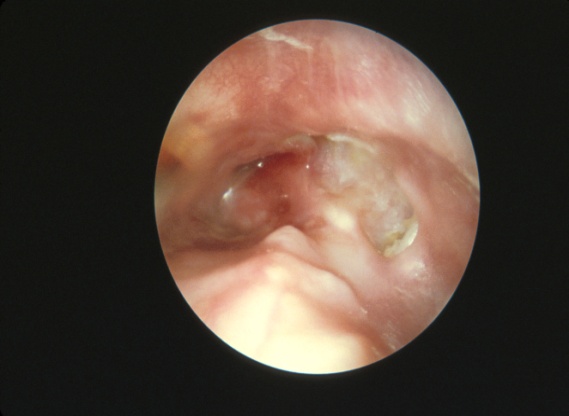 膽脂瘤(cholesteatoma)是一種中耳表皮樣囊腫(epidermoidcyst), 常見的是後天性膽脂瘤(acquired cholesteatoma)。此病的成因是由於耳膜向中耳凹入,形成袋狀空間(retraction pocket),耳膜的鱗狀上皮細胞角質層脫落在這袋狀空間,它通常從耳膜的上部或後部開始,角質層積聚物不斷增加形成中耳表皮樣囊腫,囊腫逐漸擴展至中耳後方的乳突(mastoid cavity)。圖一所示是左耳膽脂瘤,可見白色上皮角質層積聚在這袋狀空間。