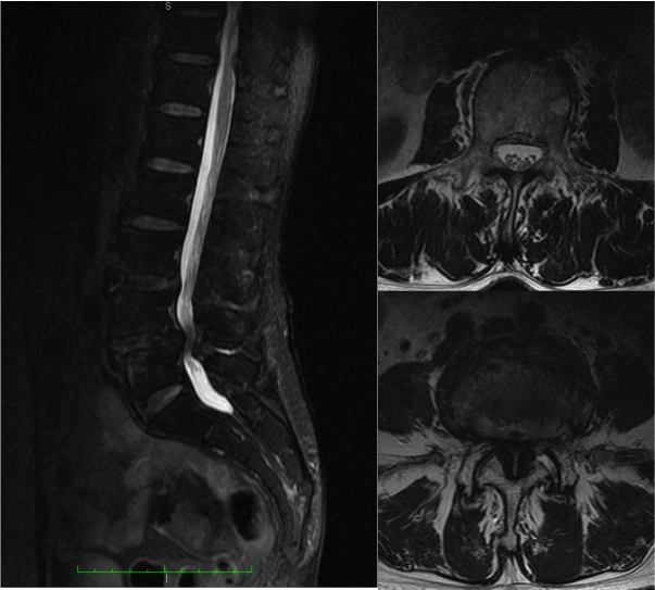 ■從磁力共振中可見腰第四、五椎管嚴重狹窄。右上圖:正常的腰椎管寬度,右下圖:腰第四、五椎管的神經組織幾乎看不見了。