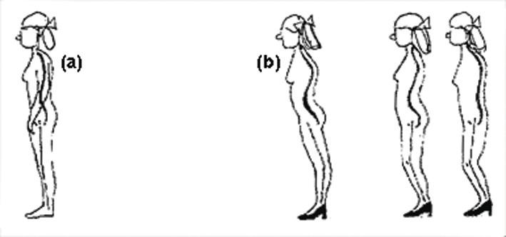 (b) 不同高度的高跟鞋會造成不正常的站姿