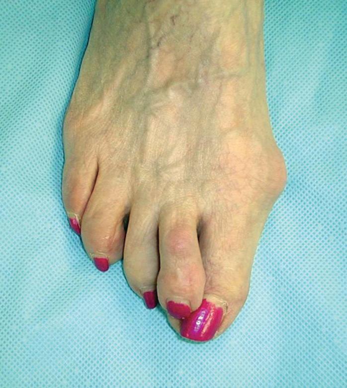 高跟鞋會導致足底部產生繭、腳拇趾腫痛和外翻(圖三)、鎚形趾、足底筋膜炎及扭傷足踝。