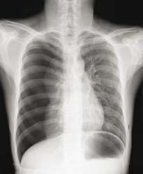 ■從X光照片中,可以見到患者的左肺因氣胸而被空氣壓至萎縮。