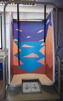 圖七為平衡體態測試儀器,患者需站於平臺上,面前的圍繞壁畫及平臺會移動,作為暈眩/平衡復康訓練前後的比較。暈眩/平衡復康訓練透過下肢的練習及眼睛的定向,來幫助患者自行調節眩暈感覺及增加平衡感。