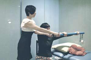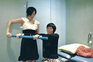 雙手握着長棍子/傘子,左右移動長棍子並保持肩膊水平,治療師/照顧者可在旁加以協助。左右各重複10次。