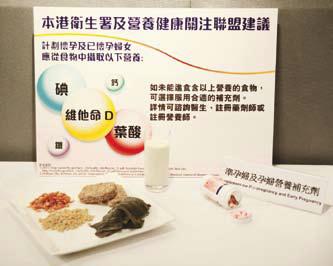 衛生署及營養健康關注聯盟建議,準備或已懷孕婦女應特別留意的營養素,除了維他命D、碘質及葉酸外,亦要多攝取鐵質及鈣質。