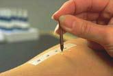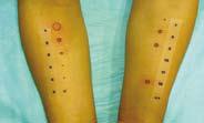 將致敏源精華滴在前臂的皮膚上,然後用針輕輕刺一刺(見圖一),如果15分鐘後皮膚出現與蚊叮相似的敏感反應(見圖二),即表示對該種物質敏感。